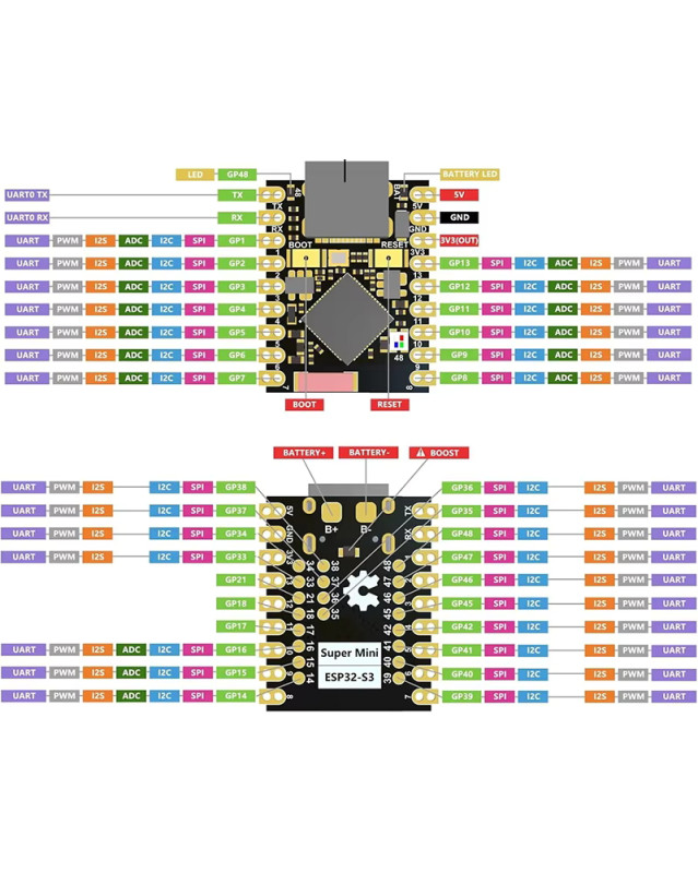 Плата мікроконтролера ESP32-S3 SuperMini. Оснащена 32-бітним двоядерним процесором Xtensa LX7 з тактовою частотою до 240 МГц, Wi-Fi 2.4 ГГц, Bluetooth 5.0 (LE) та керамічною антеною. Сумісна з Arduino, USB Serial/JTAG.